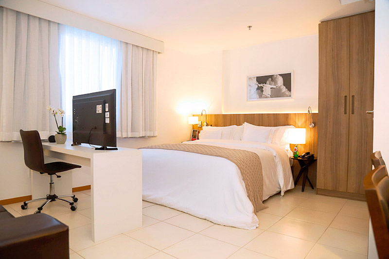 Próximo aos melhores restaurantes e bares, o hotel possui amplas suítes com minicopa, além de uma completa infraestrutura para garantir uma hospedagem de qualidade. No rooftop com vista 360º graus da cidade de Campos, você vai encontrar saunas com hidromassagem e uma completa sala de jogos.